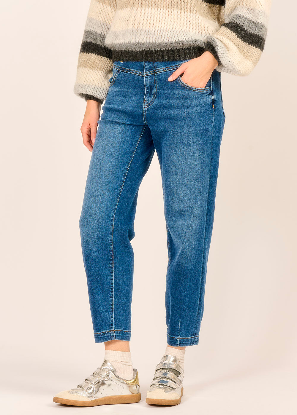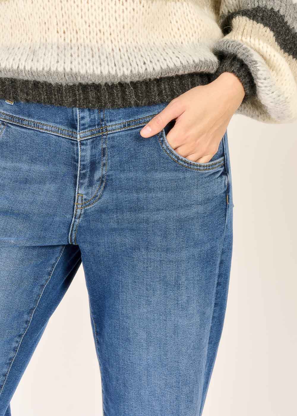 Diese moderne Slouchy Jeans in mittlerer Blau-Waschung definiert Komfort und Coolness neu und ist ein Muss für jeden entspannten Look. Sie ist bewusst etwas höher geschnitten und bietet durch ihre lockere, entspannte Passform ein unglaublich bequemes Tragegefühl, ohne dabei auf Style zu verzichten. Perfekt für den lässigen Alltags-Chic – kombinieren Sie sie mit Strick oder einer eleganten Bluse, um Ihre entspannte Silhouette zu betonen.