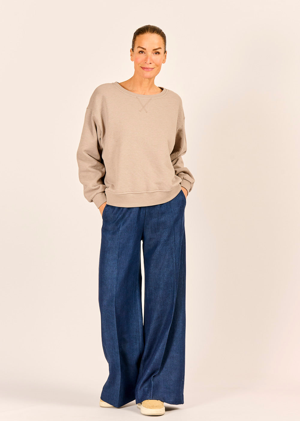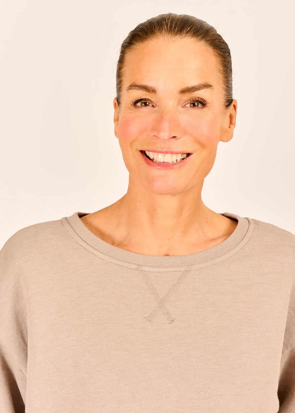 Dieses lässige Sweatshirt in der modernen Farbe Fango (ein warmes Taupe) ist Ihr neues Essential für stilvolle Gemütlichkeit im Alltag. Gefertigt aus einem wunderbar weichen Material, verspricht es maximalen Wohlfühl-Komfort und wird schnell zu Ihrem Lieblingsstück. Der lockere Schnitt und der klassische Rundhalsausschnitt mit dezenten Ziernähten sorgen für einen cleanen, entspannten Look. Kombinieren Sie das vielseitige Basic zur Jeans für einen unkomplizierten Casual-Look oder als stilvollen Bruch zu eleganten Hosen.